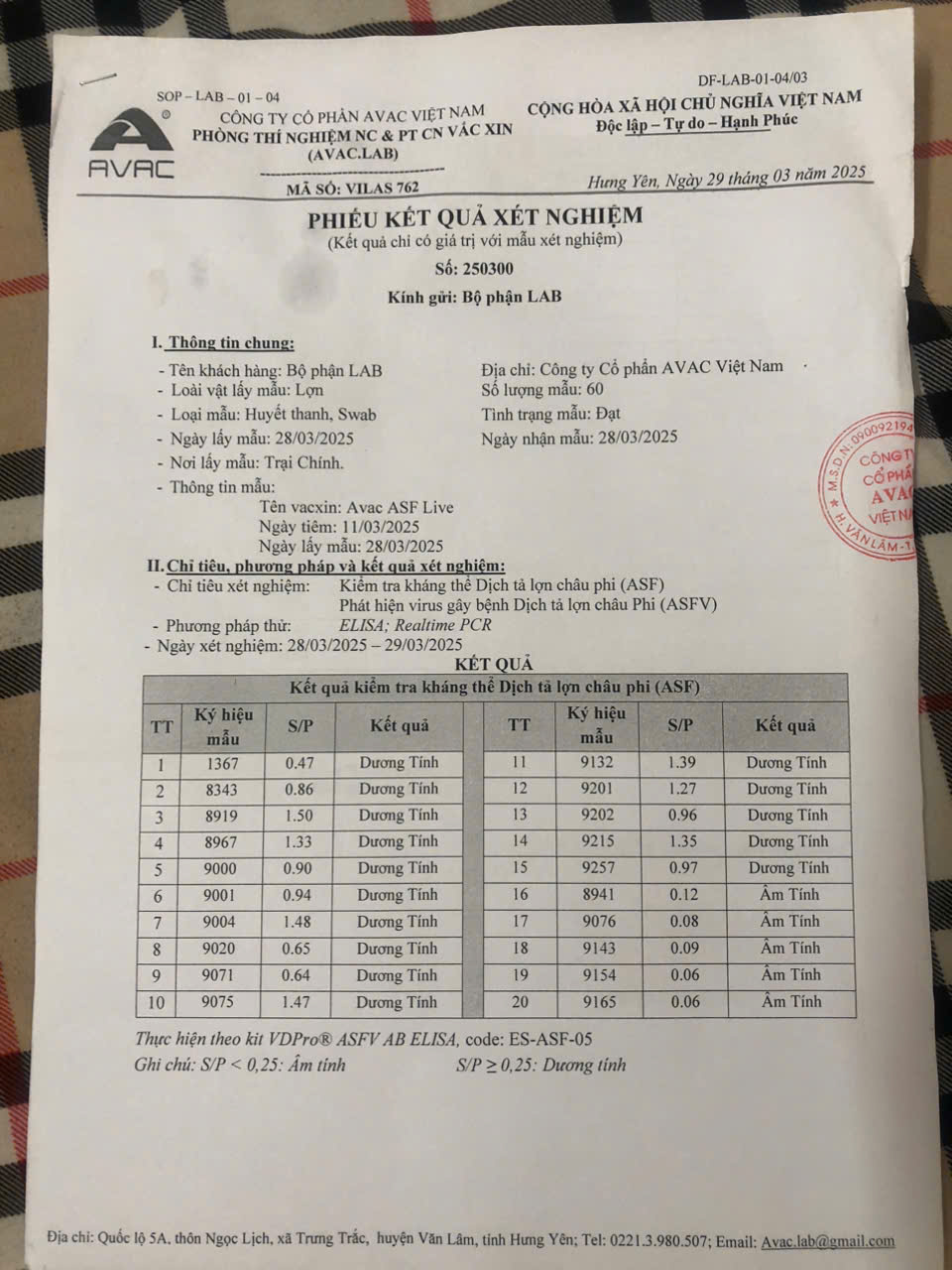 Ngày 28/03/2025: Công ty lấy mẫu để kiểm tra vi rút và kháng thể trước khi tiêm mũi 2. Ngày 29/03/2025, kết quả như sau: Lấy 15 mẫu trên lợn đã tiêm trên vắc xin, và 5 mẫu đối chứng. Trong 15 mẫu tiêm vắc xin, thì có 100% mẫu dương tính với kháng thể sau 17 ngày tiêm, tức là có đáp ứng miễn dịch đối với vius vắc xin. Có 7/15 mẫu máu còn phát hiện thấy DNA vi rút vắc xin với tải lượng thấp trong máu. Công ty cũng lấy mẫu nước tiểu và nước bọt xét nghiệm, tất cả các mẫu này đều âm tính, tức là không phát hiện có virus và bài thải bằng phương pháp xét nghiệm qPCR. Cả 5 con chưa tiêm để làm đối chứng đều âm tính với xét nghiệm phát hiện DNA virus (qPCR) và kháng thể kháng vi rút Dịch tả lợn châu Phi (ELISA).