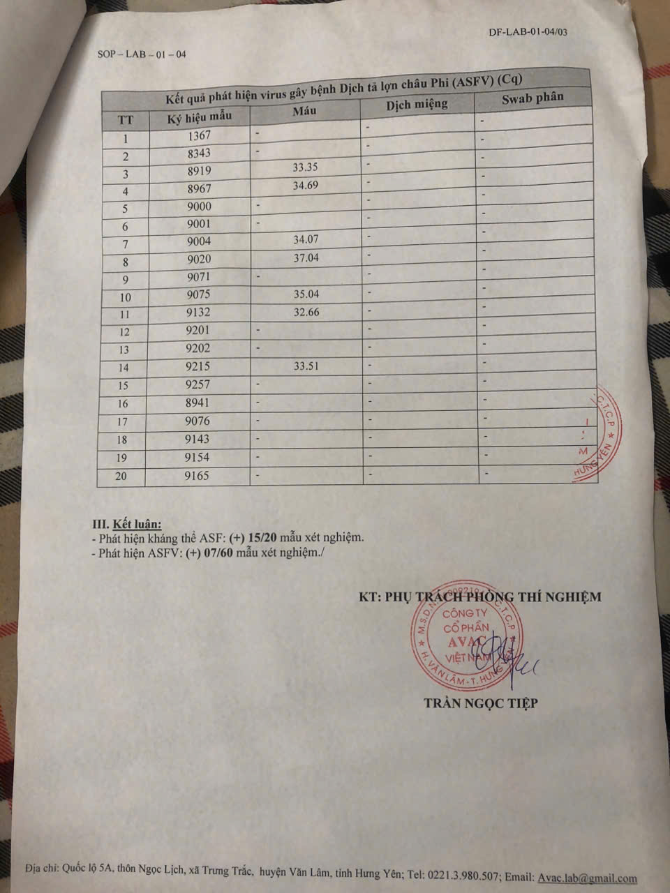 Phiếu kết quả xét nghiệm sau khi tiêm vắc xin AVAC ASF LIVE lần 1 trên 270 lợn